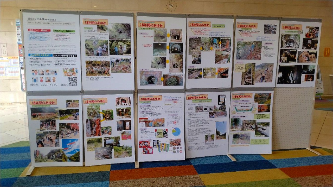 多治見の「ヤマカまなびパーク」の1階のロビーにて、11/23~11/28までの1週間にわたり、当会のパネル展を開催しました。 愛岐トンネル群の18年間の活動の紹介とトンネル群の 四季の写真などを展示。パネルが23枚あり、たいへん濃い内容です。 多くの方にご覧いただけたことと考えます。