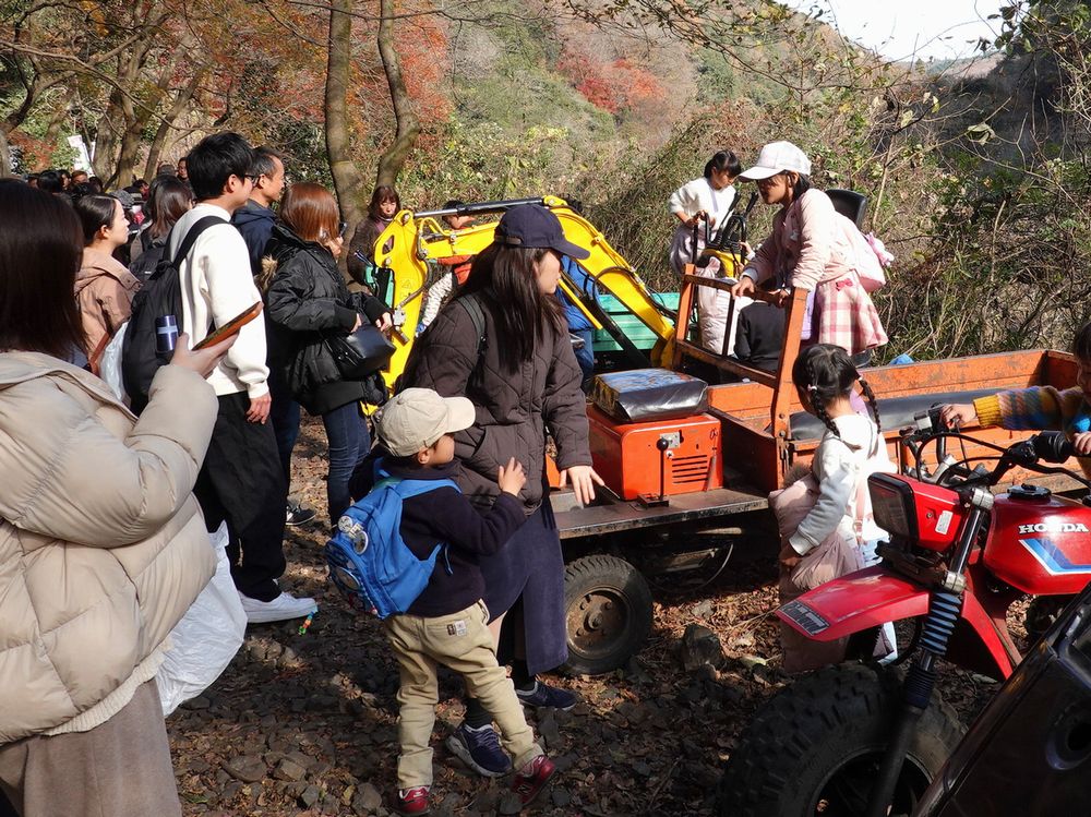 。会場はマルシェの手前。ユンボ、三輪バギー、運搬車、ダイハツミゼット(4輪タイプ)など。土日は子どもたちで大賑わいです。