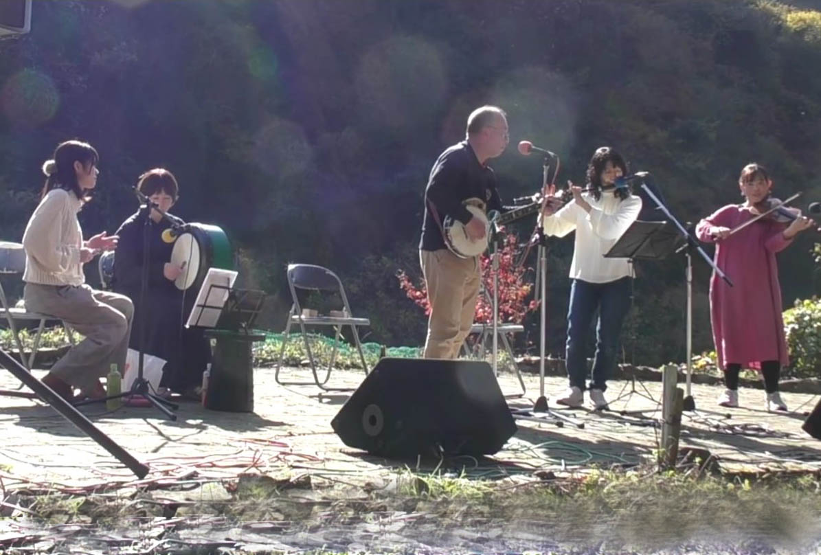 月ノ中さんのステージ。今日はフルートとバンジョーに加えてバイオリン、タイコ、スプーンと楽しいメンバー。竹林会場でも演奏しました。