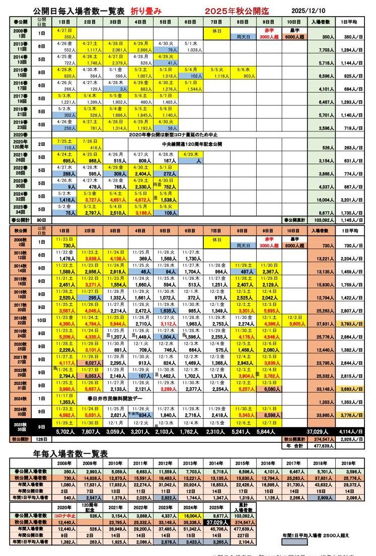 「公開日ごと入場者数一覧表」 は毎年の春と秋の入場者数を公開日ごとに記録し、表にしたものです。もうひとつは「公開年ごと、春秋ごとの入場者数のグラフ」です。